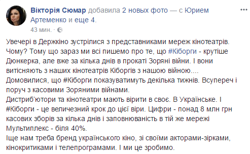 "Вечером в Госкино встретились с представителями сетей кинотеатров. Почему? Потому что сейчас мы все пишем о том, что "Киборги" - круче "Дюнкерка", но уже через несколько дней в прокате "Звездные войны". И они вытесняют из наших кинотеатров киборгов с нашей войной... Договорились, что Киборги будут показывать несколько недель. Вопреки и рядом с кассовыми "Звездными войнами". Дистрибьюторы и кинотеатры должны верить в свое. В украинском. И "Киборги" - это огромный шаг к этой вере. Цифры - более 8 млн грн кассовых сборов за несколько дней и заполняемость в той же сети "Мультиплекс" - около 40%", - написала она