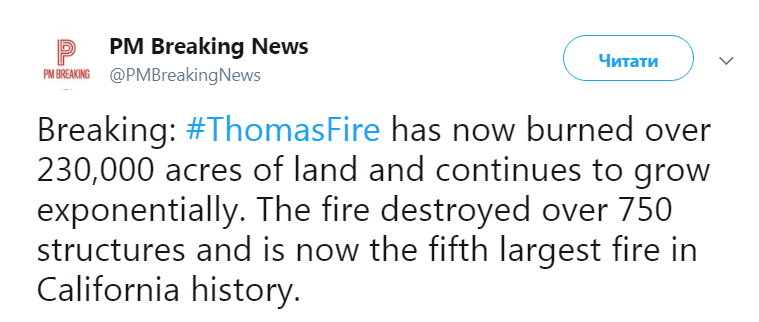 Thomas Fire: Несмотря на то, что пожарным удаётся сдерживать 10% огня, пожар уже сжёг около 230 тысяч акров (930 квадратных км). По данным CalFire, этот пожар уже является самым масштабным для округа Вентура и пятым по величине в современной истории Калифорнии. Он разрушил 790 зданий, а на борьбу с ним ушло 34 миллиона долларов.