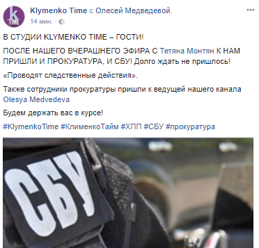 "В студии KlymenkoTime - гости! После нашего вчерашнего эфира с Татьяной Монтян, к нам пришли и прокуратура, и СБУ! Долго ждать не пришлось! Проводят следственные действия", - говорится в сообщении.