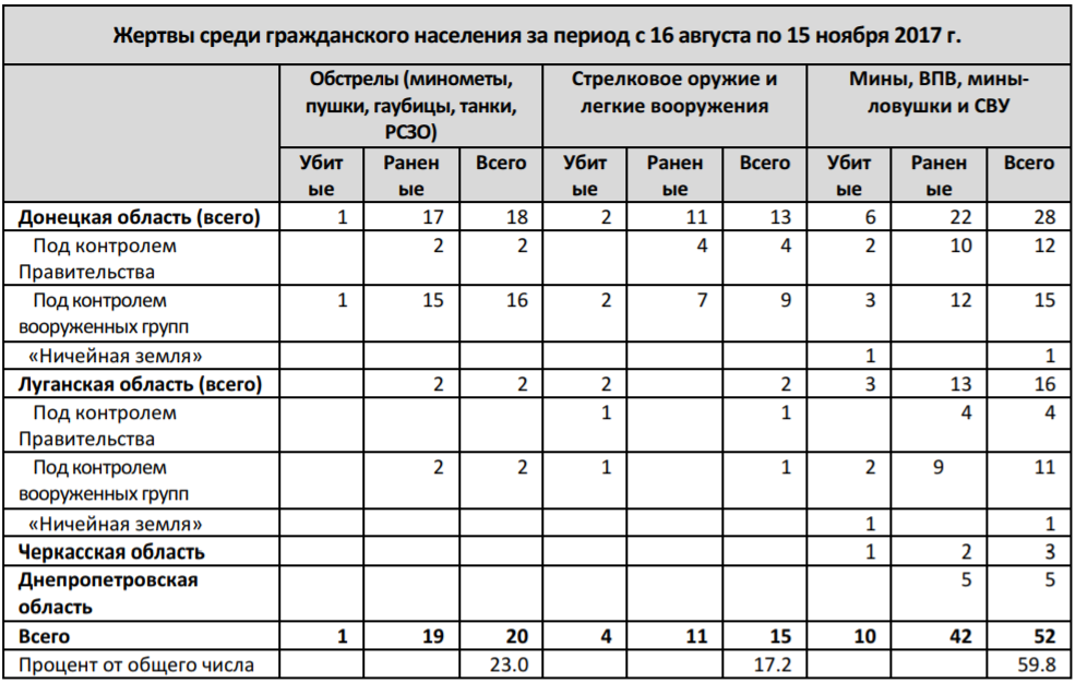 Тем не менее, жертв конфликта стало на 48% меньше, чем за весенне-летний период. Всего с августа по ноябрь погибло 15 и ранено 72 человека.