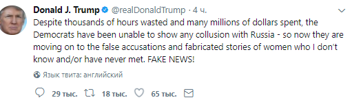 "Потратив впустую тысячи часов и миллионы долларов, демократы не смогли продемонстрировать сговор с Россией. Поэтому теперь они переходят к ложным обвинениям и сфабрикованным рассказам о женщинах, которых я не знаю и/или никогда не встречал. Фейковые новости!" - написал Трамп.