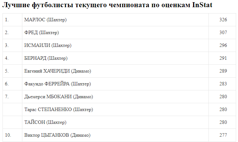 Международная  спортивно - статистическая компания InStat признала лучшим игроком нынешнего чемпионата Украины по футболу полузащитника Шахтера Марлоса.
