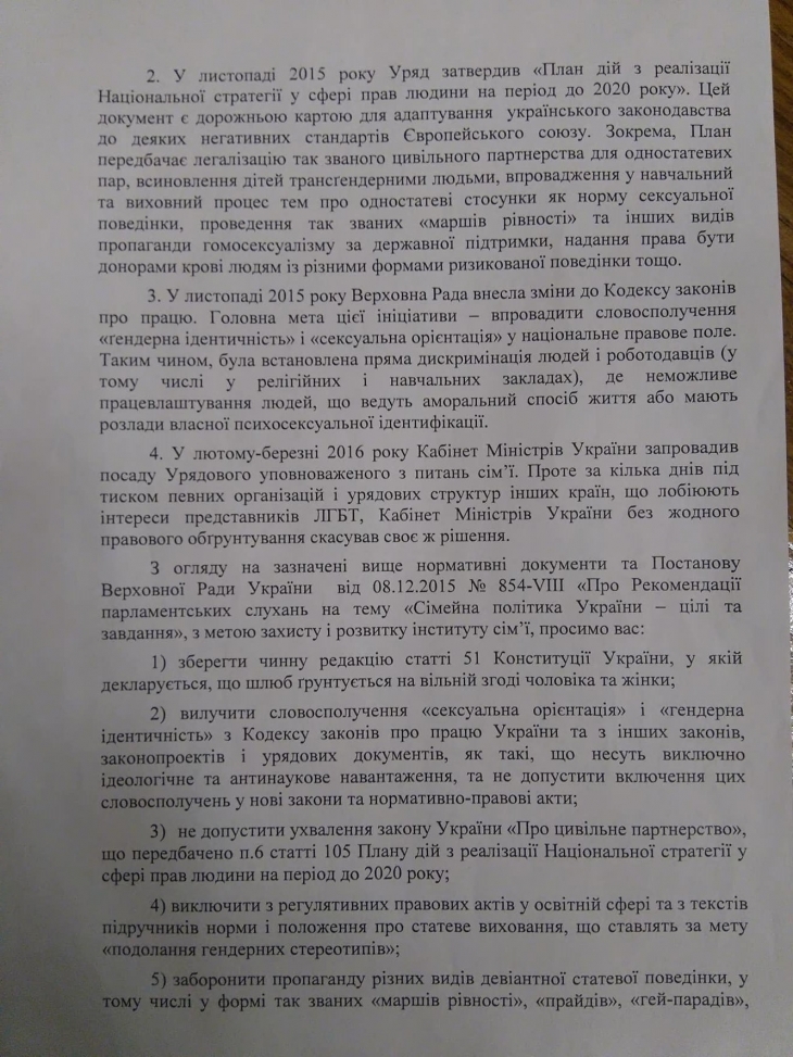 В обращении предлагается запретить все марши и акции ЛГБТ, а также "исключить словосочетания "сексуальная ориентация" и "гендерная идентичность" из Кодекса законов о труде Украины и из других законов, законопроектов и правительственных документов как несущие исключительно идеологическую и антинаучную нагрузку".