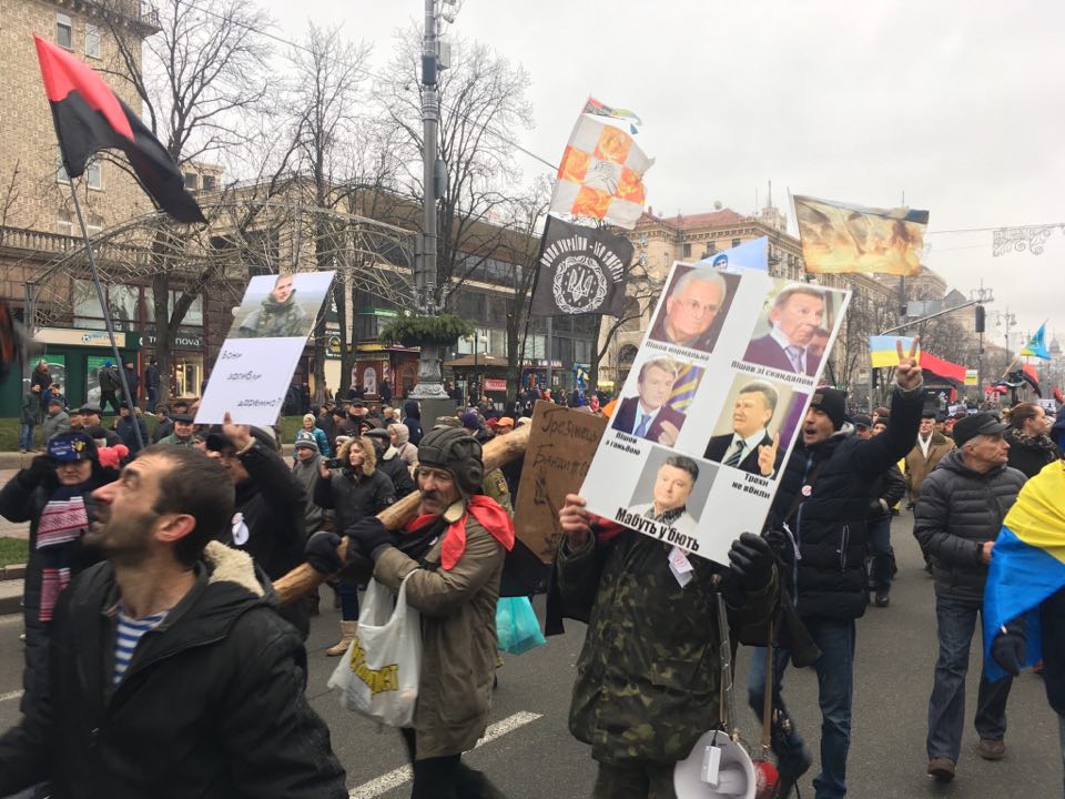 13:00 В ходе шествия по Крещатику плотность лозунгов и воззваний резко выросла. Киев призывают вставать, Порошенко - убрать руки от НАБУ и пройти на нары (которые будут рядом с нарами Януковича). Олигархам отдельно рекомендуется покинуть Украину.