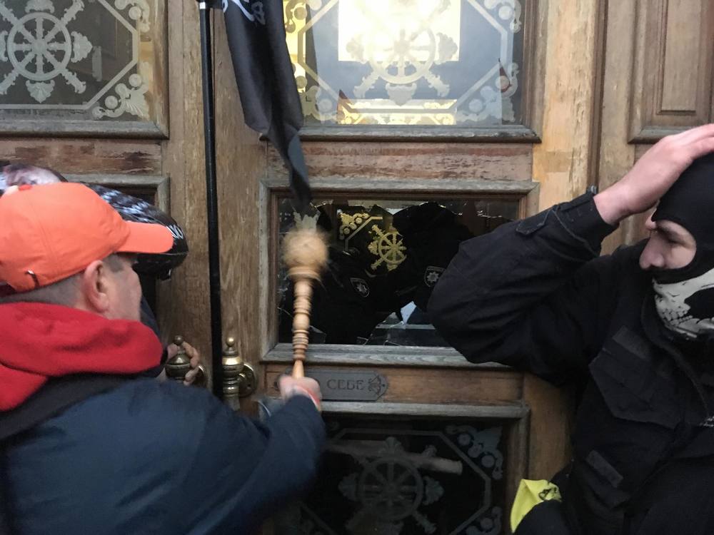 15:25 Выбили стекла в двери. Но изнутри полиция начала поливать майдановцев из порошковых огнетушителей. Поэтому внутрь активисты еще не пробрались.