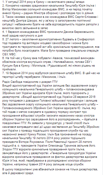В частности, по его данным, во время крымских событий и.о. президента Турчинов не обязан был созывать 28 февраля 2014 г. заседание СНБОУ. Однако Турчинов передал свои полномочия в части использования ВСУ на случай вооруженной агрессии другому органу - СНБО, у которого таких полномочий нет согласно Конституции Украины.