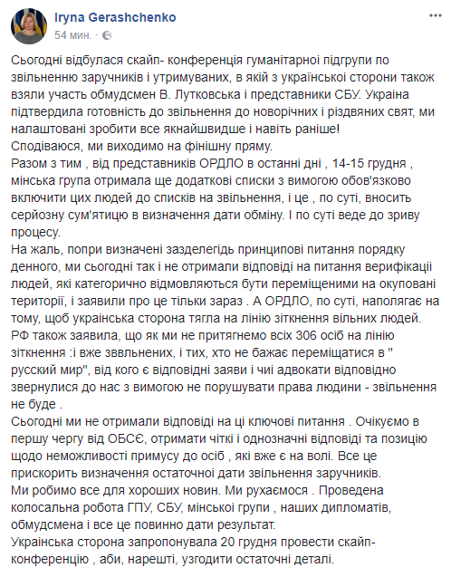 "ОРДЛО настаивает на том, чтобы украинская сторона тянула на линию столкновения свободных людей. РФ также заявила, что пока мы не привлечем всех 306 человек на линию соприкосновения: и уже освобожденных, и тех, кто не желает перемещаться ни за что, - освобождения не будет. Не получили ответа на эти ключевые ответы. Ожидаем в первую очередь от ОБСЕ получить четкие и однозначные ответы и позицию относительно исключения из списков избирателей лиц, которые уже на свободе. Все это ускорит определение окончательной даты освобождения заложников", - заявила Геращенко.