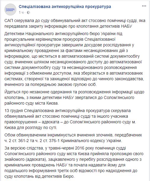 Специализированная антикоррупционная прокуратура направила в суд обвинительный акт в отношении помощницы судьи Соломенского райсуда Киева, которая "сливала" третьим лицам закрытую информацию о ходатайствах детективов НАБУ. Об этом сообщает пресс-служба САП в Facebook.