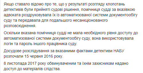 По версии следствия, в мае-июне 2016 года помощница судьи приняла предложение своего знакомого адвоката, заинтересованного в ходе расследования одного из уголовных производств НАБУ, и начала предоставлять ему для дальнейшего информирования третьих лиц сведения о поступлении в суд ходатайств от детективов бюро.