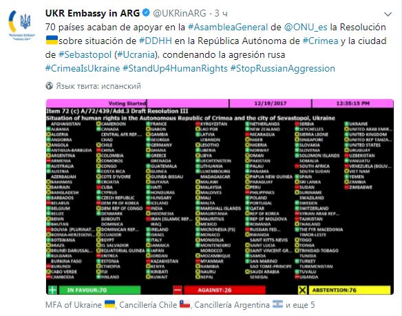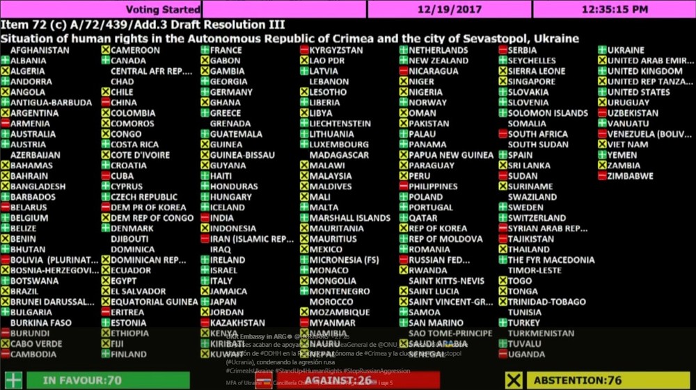 Как сообщает посольство Украины в Аргентине в Twitter, 26 стран-членов Генассамблеи ООН проголосовали против обновленной резолюции по правам человека в оккупированном Крыму.