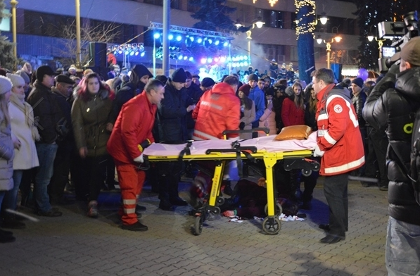 По словам очевидцев, петарда оторвалась от фейерверка, который сопровождал церемонию зажжения огней на елке. Она попала в лицо девушке, которая потеряла сознание. Пострадавшую госпитализировала скорая помощь с травмами лица и головы. Она потеряла много крови.