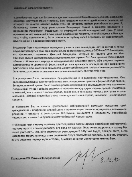 Экс-владелец нефтяной компании "ЮКОС" Михаил Ходорковский обратился к главе российской ЦИК с просьбой не регистрировать Владимира Путина в качестве кандидата на выборах президента-2018.