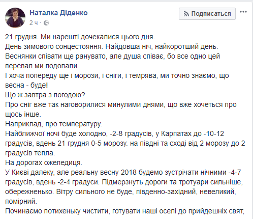Она рассказала, какую погоду украинцам ожидать в день зимнего солнцестояния.