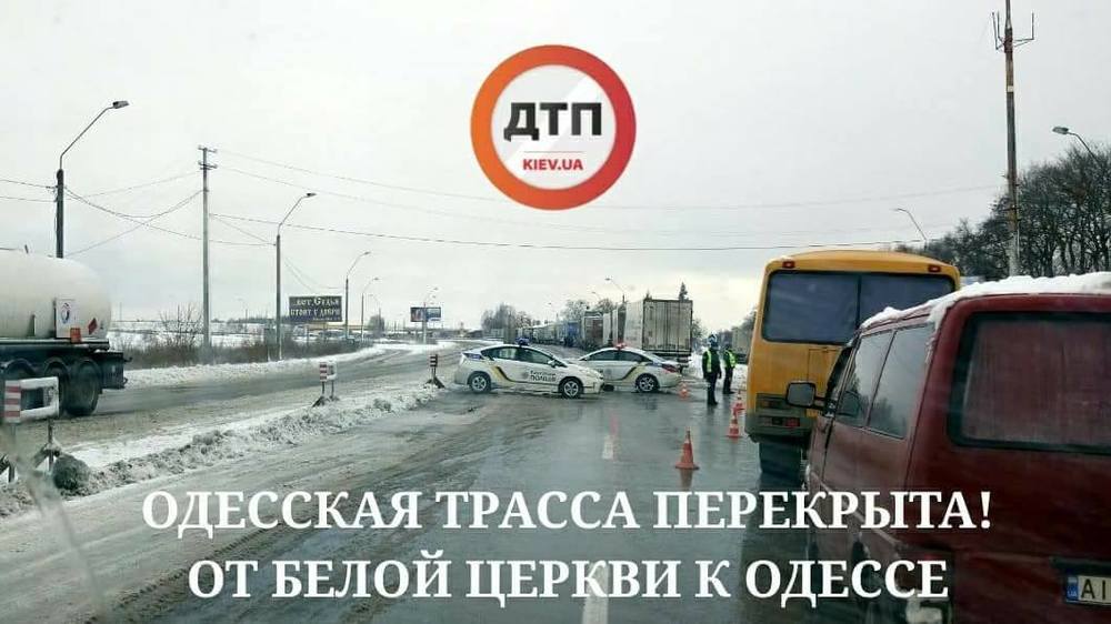 К 7 утра на участке дороги Киев-Одесса, на границе Киевской и Черкасской областей, между Белой Церковью и Жашковом, образовалась пробка, вызванная скользкой дорогой и застрявшими в снегу фурами.
