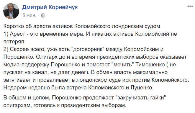 "Скорее всего, уже есть "договорняк" между Коломойским и Порошенко. Олигарх до и во время президентских выборов оказывает медиа-поддержку Порошенко и помогает "мочить" Тимошенко ( не пускает на канал, не дает денег). В обмен власть максимально затягивает и проваливает в лондонском суде иск против Коломойского. Недаром недавно была встреча Коломойского и Луценко.