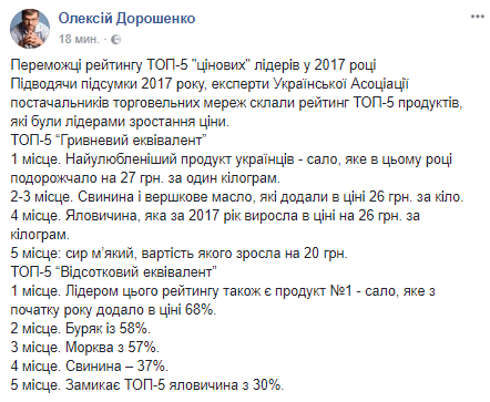 В Украине названы пять продуктов, которые больше всего подорожали в этом году. Об этом сообщил председатель Ассоциации поставщиков торговых сетей Алексей Дорошенко в Facebook.