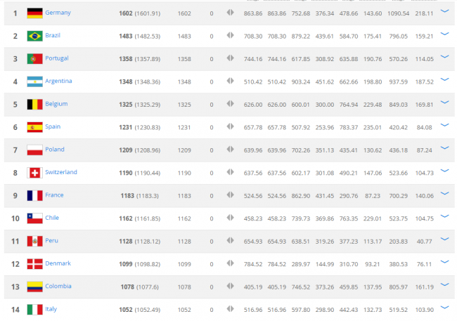Первая десятка осталась без изменений. Лидирует действующий чемпион мира - сборная Германии. На втором месте пентакампеоны, сборная Бразилииб, а замыкают тройку лидеров чемпионы Европы - сборная Португалии.