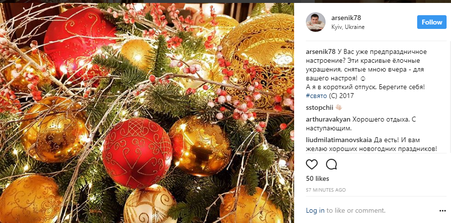 "У Вас уже предпраздничное настроение? Эти красивые ёлочные украшения, снятые мною вчера - для вашего настроя! А я в короткий отпуск. Берегите себя!" - написал Аваков.
