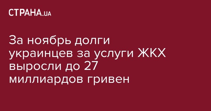 В ноябре этого года задолженность украинцев по оплате жилищно-коммунальных услуг увеличилась на 8,8% по сравнению с октябрем и составила 27,1 млрд грн (без учета электроэнергии).