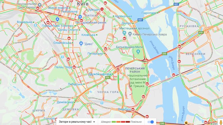 Движение затруднено по улице Саксаганского, Владимирской, Пушкинской, Хрещатик, Большой Житомирской и Набережно-Крещатицкой.