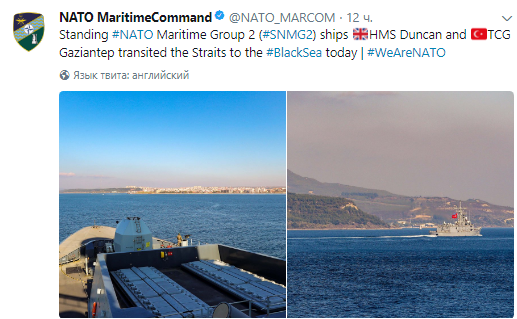 "Входящие в состав постоянной военно-морской группы НАТО №2 (SNMG2) британский эсминец Duncan и турецкий фрегат "Газиантеп"… вошли в Черное море сегодня", - говорится в в сообщении.