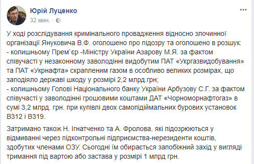 Генпрокуратура сообщила о подозрении бывшим премьер-министру Николаю Азарову и главе Нацбанка Сергею Арбузову по делу о хищениях сжиженного газа. Об этом генпрокурор Юрий Луценко сообщил в Facebook.