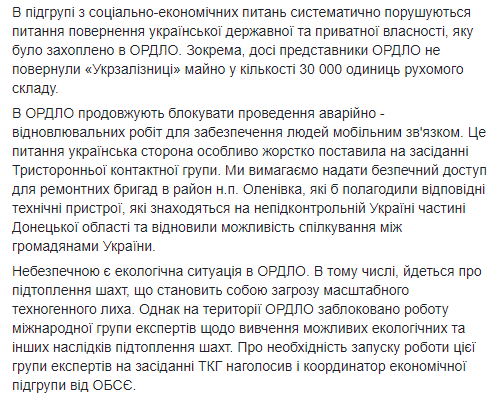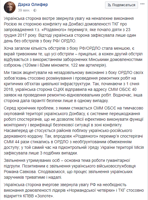 Также Киев заявил о ненадлежащем исполнении Россией как стороной конфликта на Донбассе договоренности о "рождественском перемирии", а сепаратистами из т.н. "ЛДНР" - разминировании и проведению ремонтных работ.