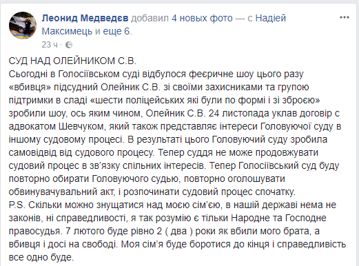 Суд может с нуля начать расследовать громкое дело патрульного Сергея Олейника, который застрелил подростка Михаила Медведева во время погони за BMW в Киеве в 2016 году. Об этом заявил брат погибшего Леонид Медведев в Facebook.