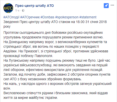 "С начала суток зафиксировано 2 обстрела опорных пунктов сил АТО со стороны незаконных вооруженных формирований. К сожалению, вследствие одного из вражеских обстрелов погиб украинский военный", - сообщает пресс-центр штаба АТО в сводке по состоянию на 18:00 среды, опубликованной в соцсети Facebook.