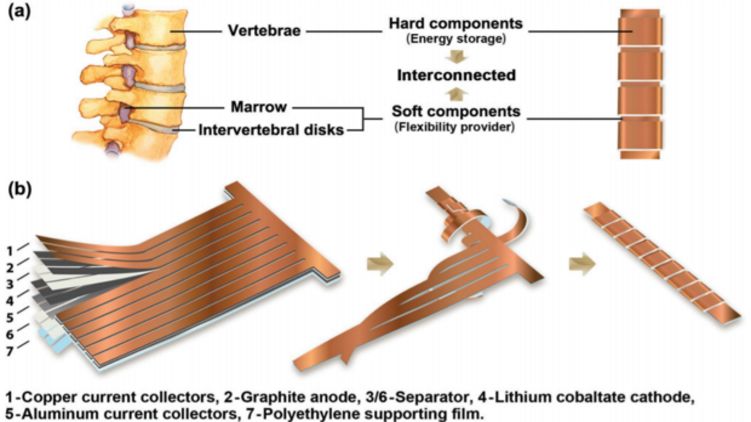 Инженеры предложили новую конструкцию для гибких и при этом емких литий-ионных аккумуляторов. Они надрезали листовой аккумулятор на полоски и обернули их вокруг единого "хребта", подобно позвоночнику человека.