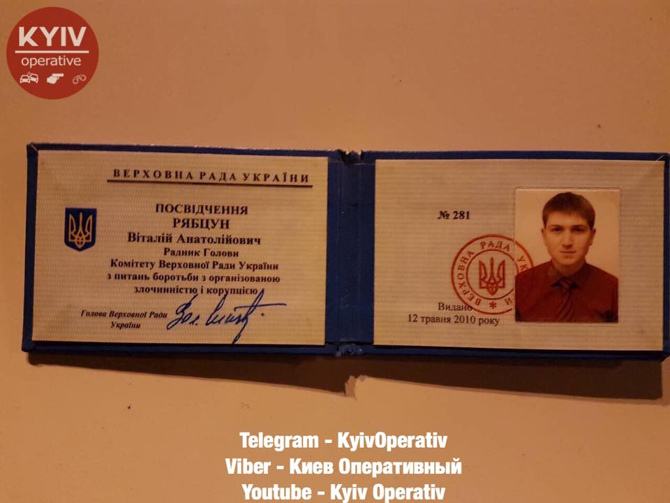 У одного из мужчин оказалось липовое удостоверение "советника главы комитета Верховной Рады по вопросам борьбы с организованной преступностью и коррупцией". Такого комитета не существует.