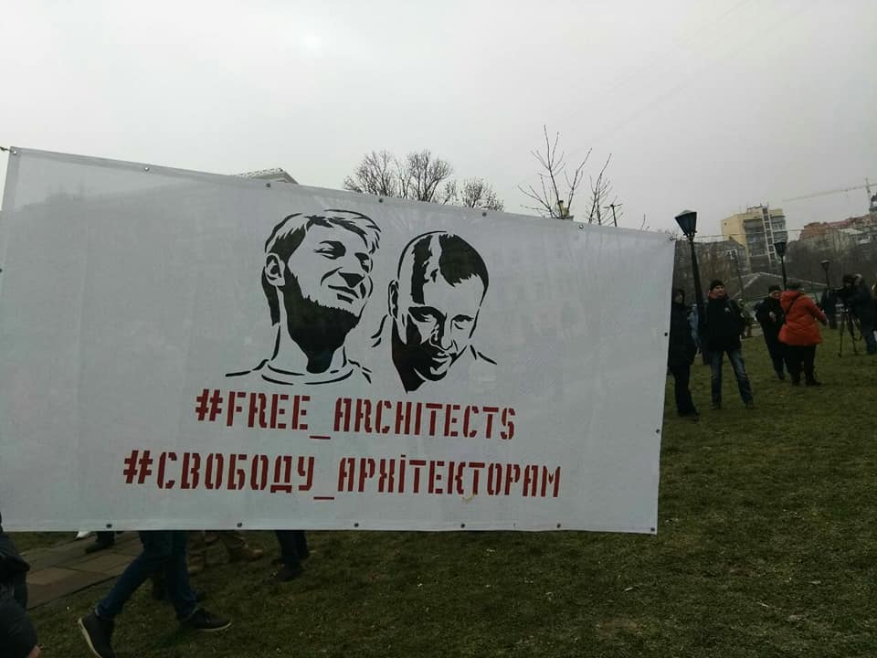Они держат в руках плакаты "Свободу архитекторам" – такую неожиданную кличку дали поджигателям их сторонники. По всей видимости, действия по демонтажу здания храма здесь относят к отрасли архитектуры.