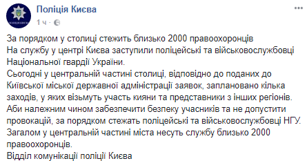 "Сегодня в центральной части столицы запланировано несколько мероприятий, в которых примут участие киевляне и представители других регионов. Чтобы должным образом обеспечить безопасность участников и не допустить провокаций, за порядком следят полицейские и военнослужащие НГУ. Всего в центральной части города несут службу около 2000 правоохранителей", - говорится в сообщении.
