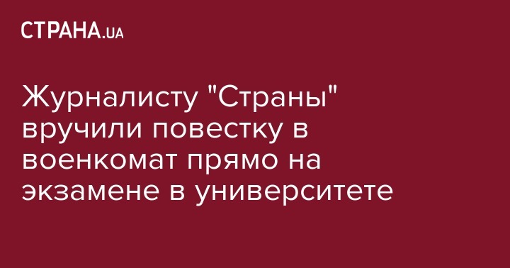 Журналисту "Страны" Кириллу Малышеву представители военкомата вручили повестку прямо на экзамене в Харьковском национальном университете им. Каразина. Об этом журналист сообщил на своей странице в Facebook.