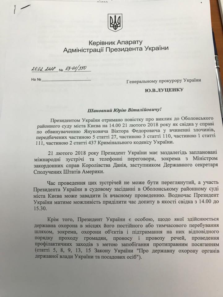 Об этом на суде заявил прокурор, который подал ходатайство о видео-допросе президента. По его словам, такая просьба поступила из АП.