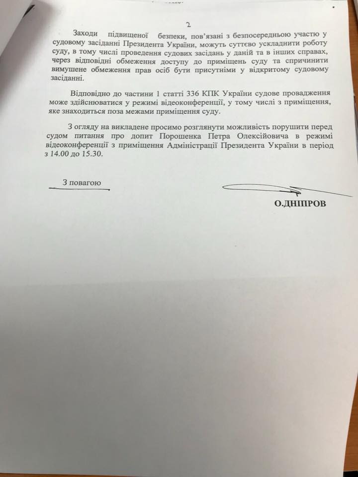 Действующий президент Петр Порошенко, который ранее обещал прийти в суд, теперь изъявил желание давать показания в режиме видеоконференции.