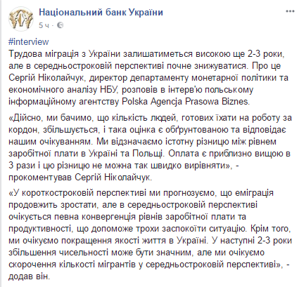 Николайчук заявил, что увеличивающееся количество украинцев, желающих уехать в Европу на заработки, является обоснованным и вполне ожидаемым. В НБУ отмечают существенную разницу в размерах оплаты труда. Польские зарплаты больше украинских в три раза. Эту разницу правительство будет выравнивать в течение последующих трех лет.