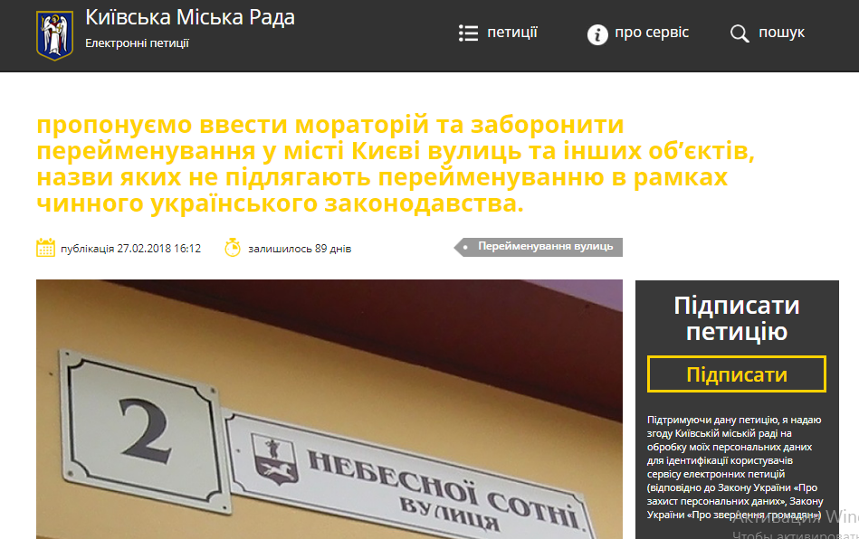 При этом, фактически с нарушением положений украинского законодательства, Киевсовет начал переименовывать улицы, площади, проспекты, названия которых не противоречат действующим нормативным актам. Эти переименования имеют исключительно идеологический характер", - говорится в пояснении к петиции.