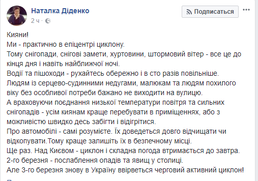 "Киевляне! Мы практически в эпицентре циклона. Поэтому снегопады, снежные заносы, метели, штормовой ветер - все это до конца дня и даже ближайшей ночью", - пишет Диденко.