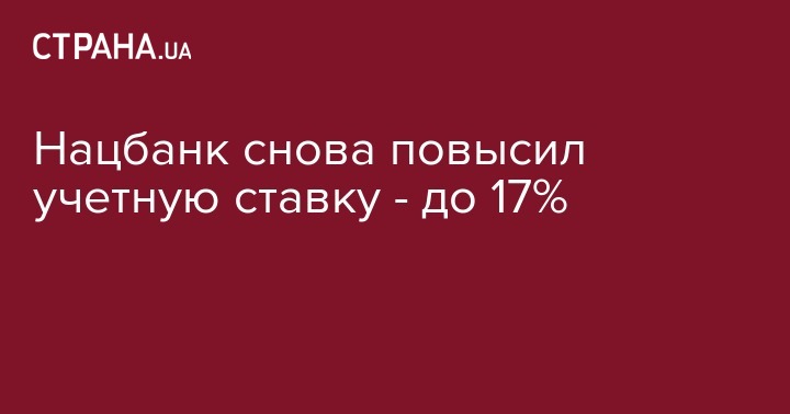 Нацбанк, как и обещал, повысил учетную ставку со 2 марта - с 16% до 17%. Об этом сообщается на сайте НБУ.