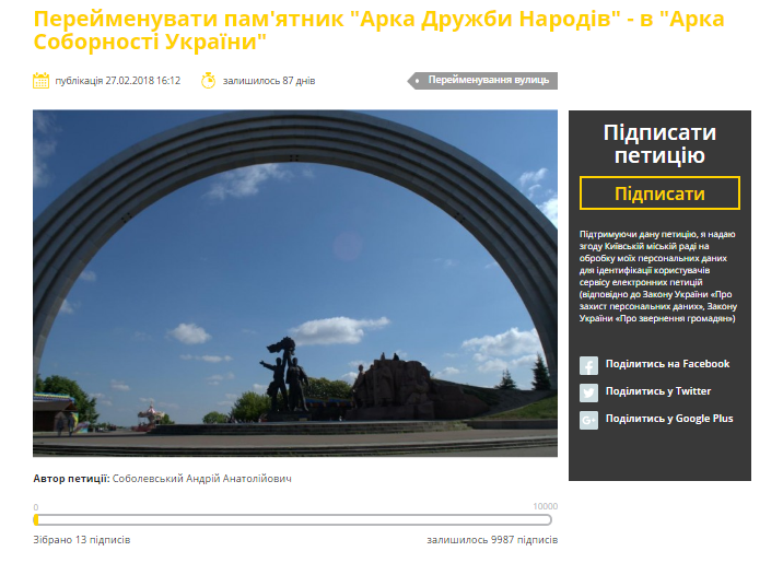Автор петиции отмечает, что в последнее время появились многочисленные предложения по сносу арки, потому что действующая название достопримечательности потеряла свою актуальность. Он предлагает сохранить один из символов украинской столицы, назвав скульптуру "Аркой Соборности Украины". К тому же такое переименование можно приурочить к 100-летию Акта воссоединения УНР и ЗУНР.
