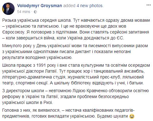 Премьер-министр Владимир Гройсман похвалил школу с обучением на украинском языке в Риге. Об этом он написал на своей странице в Facebook.
