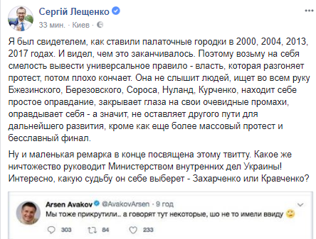 "Я был свидетелем, как ставили палаточные городки в 2000, 2004, 2013, 2017 годах. И видел, чем это заканчивалось. Поэтому возьму на себя смелость вывести универсальное правило - власть, которая разгоняет протест, потом плохо кончает. Она не слышит людей, ищет во всем руку Бжезинского, Березовского, Сороса, Нуланд, Курченко, находит себе простое оправдание, закрывает глаза на свои очевидные промахи, оправдывает себя - а значит, не оставляет другого пути для дальнейшего развития, кроме как еще более массовый протест и бесславный финал.