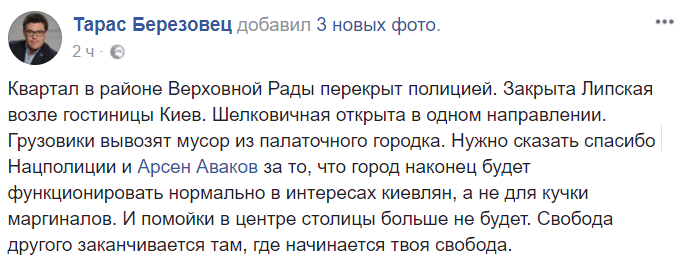 "Нужно сказать спасибо Нацполиции и Арсену Авакову за то, что город наконец будет функционировать нормально в интересах киевлян, а не для кучки маргиналов. И помойки в центре столицы больше не будет. Свобода другого заканчивается там, где начинается твоя свобода", – пишет политолог Тарас Березовец.