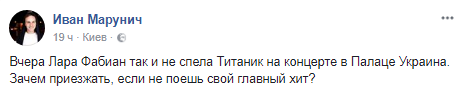 При этом фронтмен группы NRavitsa Иван Марунич пошутил, что Лара Фабиан так и не спела свой главный хит - "Титаник".