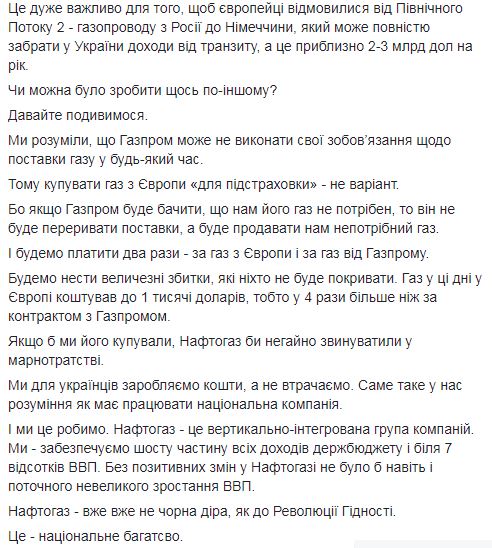 "За сутки "Нафтогаз" заменил газ, который должен поставляться от "Газпрома" на газ из Европы", - написал Витренко в Facebook.