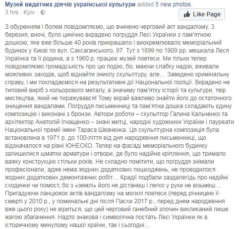 "3 марта, ночью, было цинично украдено бюст Леси Украинки с памятной доской, который уже более 40 лет украшал и выделял мемориальный дом в Киеве по ул. Саксаганского, 97. Здесь с 1899 по 1909 жила Леся Украинка и ее семья, а с 1960 г. работает музей поэтессы", - говорится в сообщении.