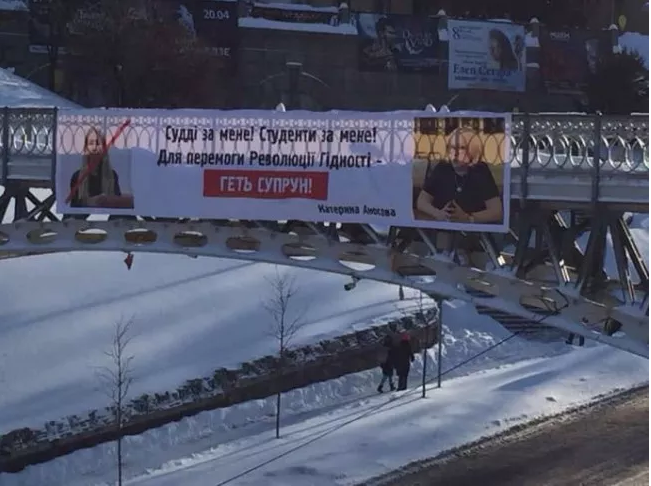 По словам Амосовой, постер содержал следующий текст: "Судьи - за меня, студенты - за меня. Для победы Революции достоинства - прочь Супрун. Екатерина Амосова".