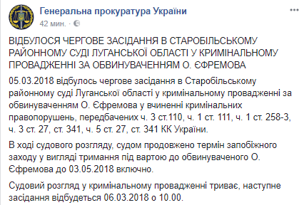 Он обвиняется в госизмене и действиях с целью изменения госграницы Украины, в организационном и другом содействии созданию и деятельности птак называемой Луганской народной республики. Сам Ефремов вину не признает.