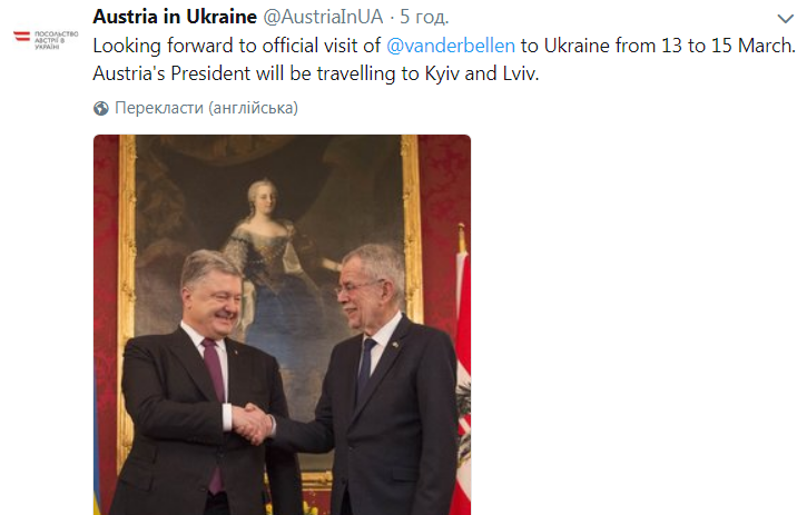 С 13 по 15 марта президент Австрии Александер ван дер Беллен и его супруга Дорис Шмидауер в сопровождении министра иностранных дел Карин Кнайссль и делегации по вопросам экономики и культуры посетят Украину с официальным визитом.